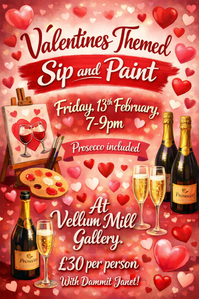 Join us at Vellum Mill Gallery to celebrate Valentines Day with some Prosecco and DammitJanet to guide you through painting your own beautiful work of art! Bring yourselves and become an artist!